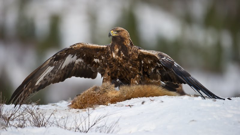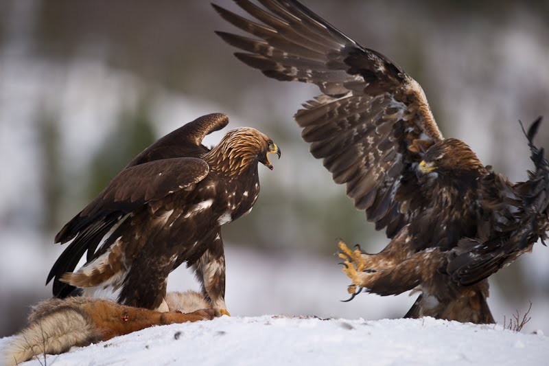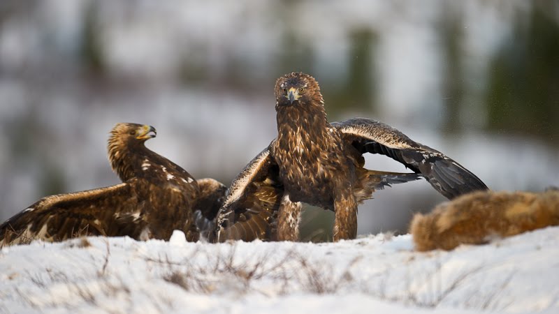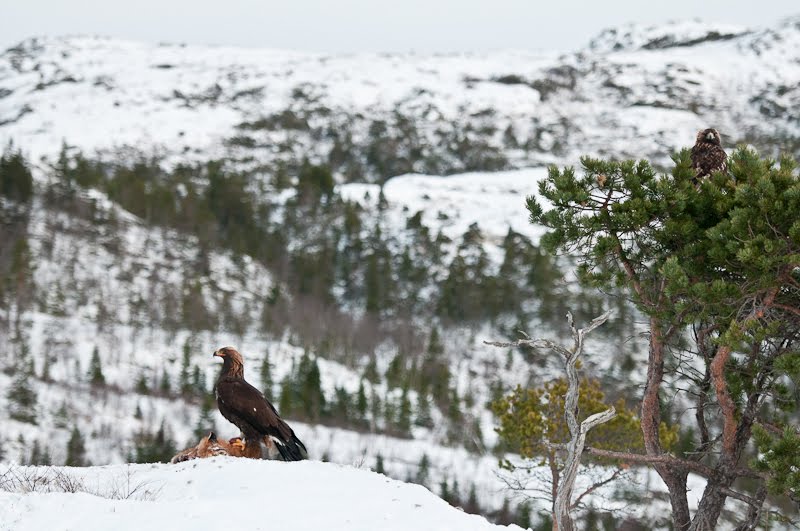 To hyggelige svensker og jeg var på plass i skjulet kl. 07.00. Om lag kl. 8 var den første ørna på plass, og deretter gikk det slag i slag frem til kl. 14. Altså var det ørn på åta kontinuerlig i hele 6 timer. Det var mellom 6 og 8 ulike ørner, og flere ganger var det fighter mellom ørnene. Helt rått! Stort sett holdt ørnene seg nærme åta, men én av ørnene satt lenge i et lite tre kun 5 – 6 meter fra oss. Det kan ikke bli mye bedre enn dette!